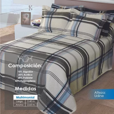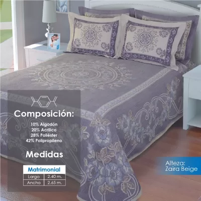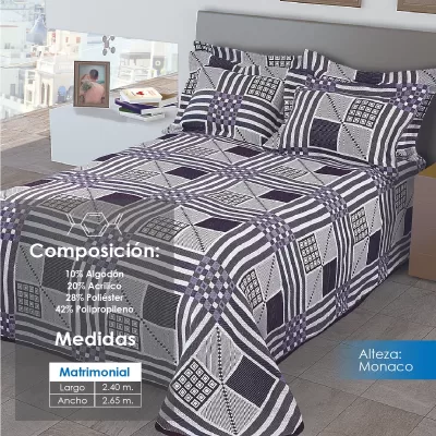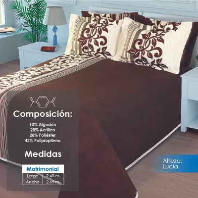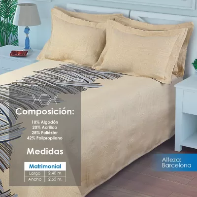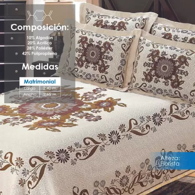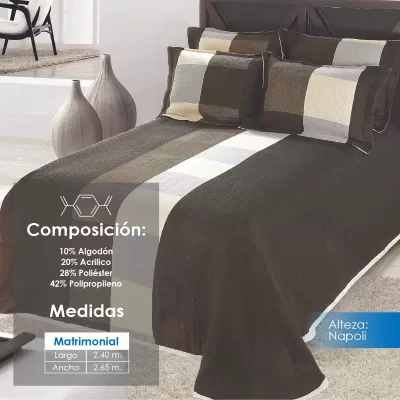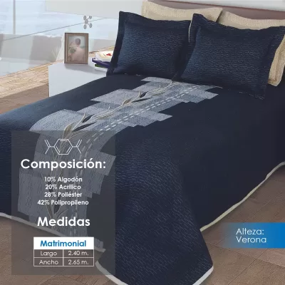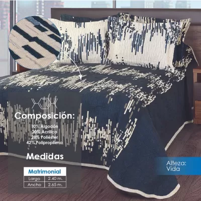 Colcha línea Alteza con diseños clásicos, perfecta para hotelería. Composición: 10% Algodón, 20% Acrílico, 28% Poliéster y 42% Polipropileno. Duradera, elegante y de fácil mantenimiento.
