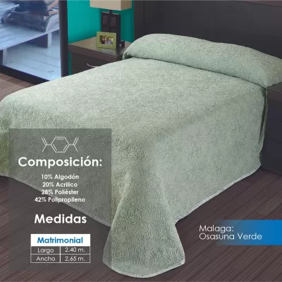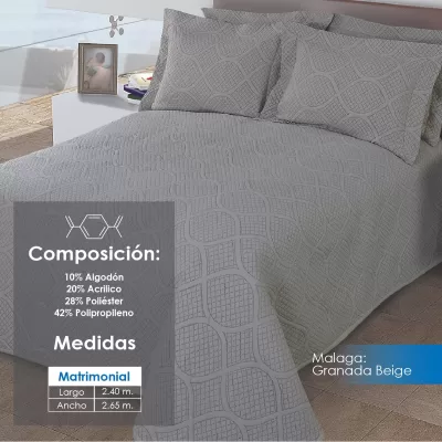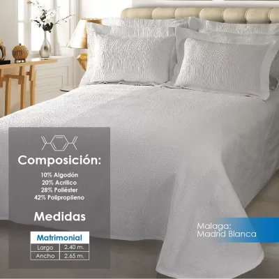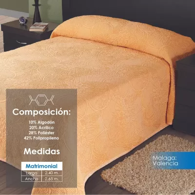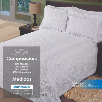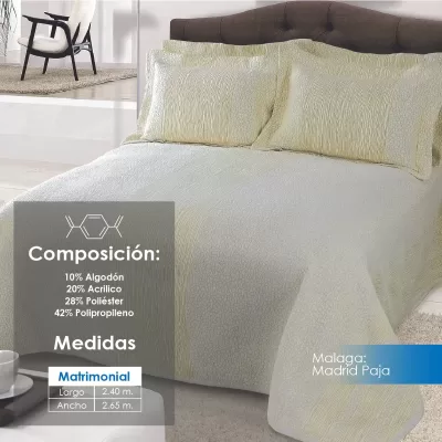 Colcha Málaga es una opción versátil y duradera, fabricada con una mezcla de 10% algodón, 20% acrílico, 28% poliéster y 42% polipropileno. Su composición garantiza resistencia, suavidad y fácil mantenimiento, siendo ideal para todo tipo de ambientes.