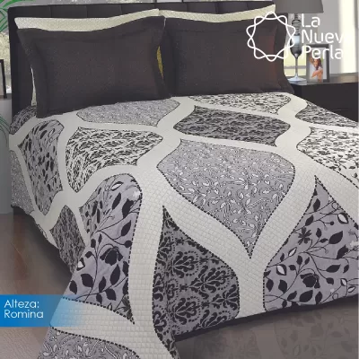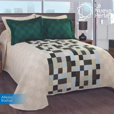Colcha línea Alteza con diseños clásicos, perfecta para hotelería. Composición: 10% Algodón, 20% Acrílico, 28% Poliéster y 42% Polipropileno. Duradera, elegante y de fácil mantenimiento.