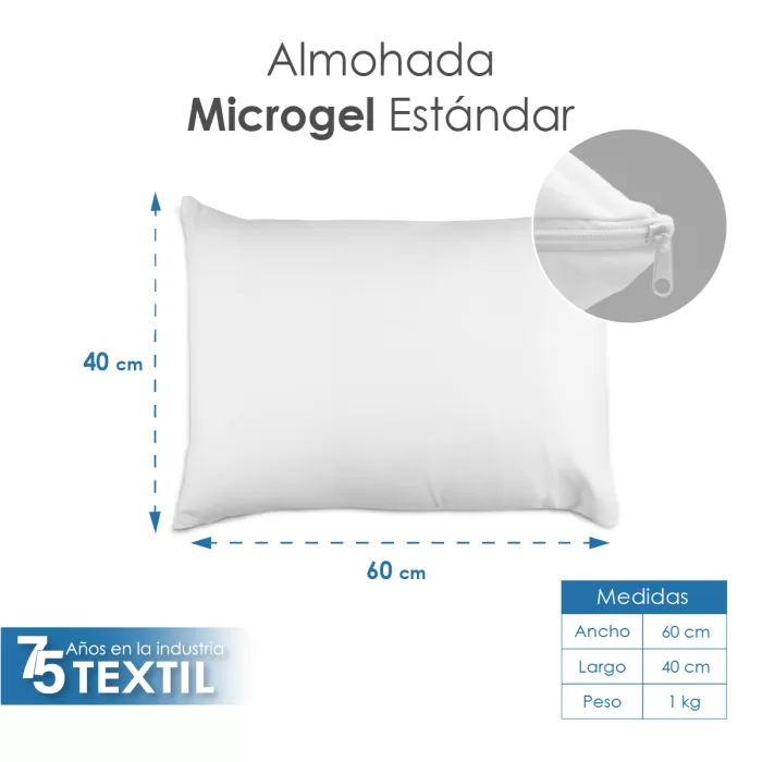 Almohada microgel en medida estándar, suave y cómoda, con funda incluida. Relleno encapsulado en tela Bonfort, peso de 1.20 kg. Perfecta para un descanso superior.