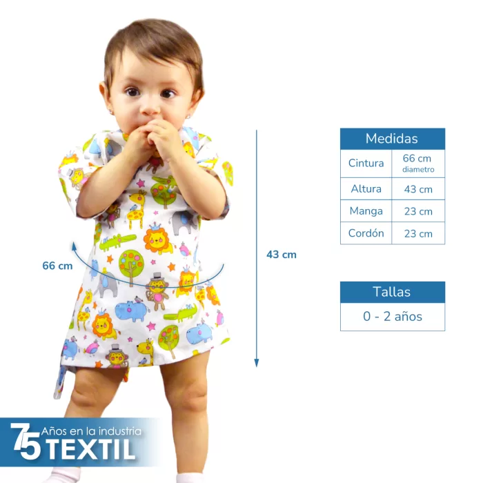 Disponemos de tallas para niños de 2 a 4 años. El corte amplio y las mangas largas permiten libertad de movimiento, manteniendo al bebé cómodo en todo momento.