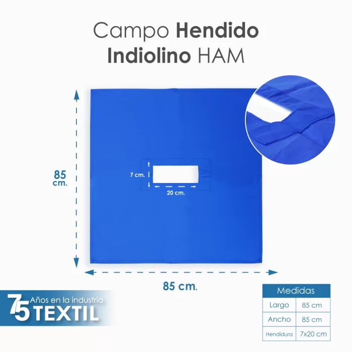 Con un peso de 180 g/m², este campo es ligero pero altamente efectivo, con hendiduras estratégicas que permiten un acceso preciso al área de tratamiento. Su color azul plumbago no solo reduce el deslumbramiento, mejorando la visibilidad del equipo médico, sino que también añade un toque profesional al entorno quirúrgico.