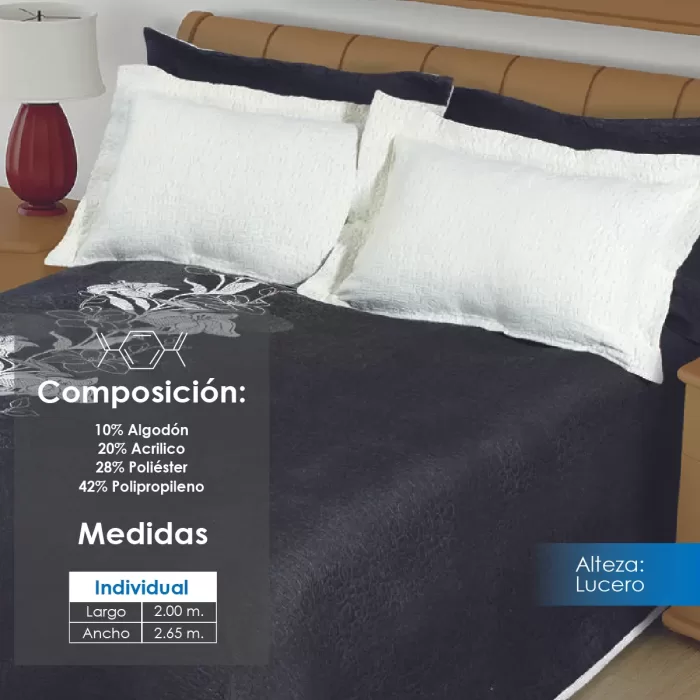 Colcha línea Alteza con diseños clásicos, perfecta para hotelería. Composición: 10% Algodón, 20% Acrílico, 28% Poliéster y 42% Polipropileno. Duradera, elegante y de fácil mantenimiento.
