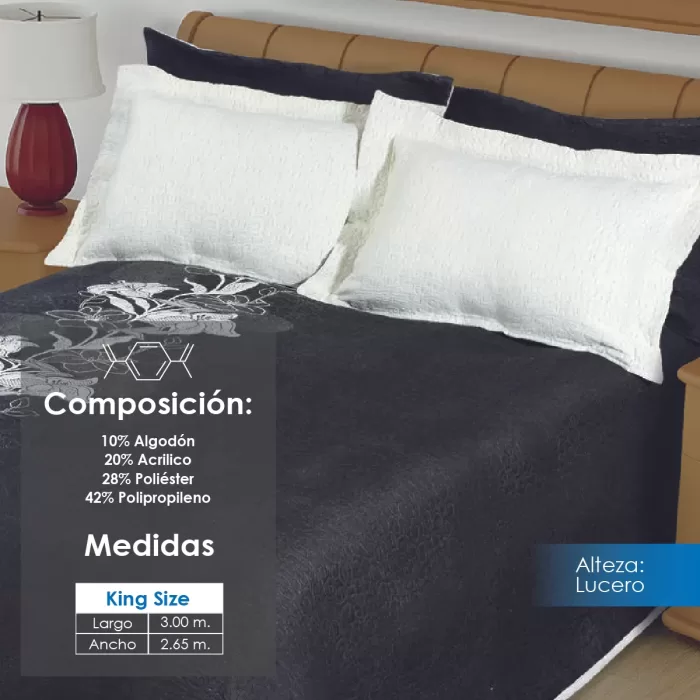 Colcha línea Alteza con diseños clásicos, perfecta para hotelería. Composición: 10% Algodón, 20% Acrílico, 28% Poliéster y 42% Polipropileno. Duradera, elegante y de fácil mantenimiento.