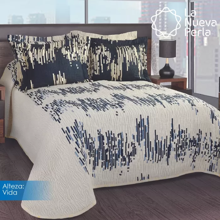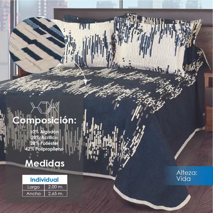 Colcha línea Alteza con diseños clásicos, perfecta para hotelería. Composición: 10% Algodón, 20% Acrílico, 28% Poliéster y 42% Polipropileno. Duradera, elegante y de fácil mantenimiento.