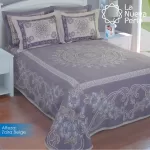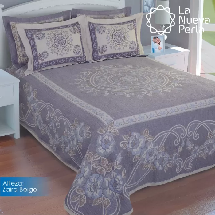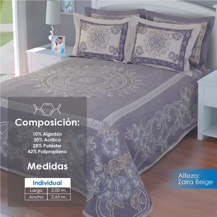 Colcha línea Alteza con diseños clásicos, perfecta para hotelería. Composición: 10% Algodón, 20% Acrílico, 28% Poliéster y 42% Polipropileno. Duradera, elegante y de fácil mantenimiento.