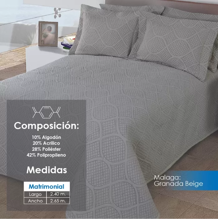 La Colcha Málaga es la elección perfecta para quienes buscan una combinación de calidad, estilo y durabilidad. Confeccionada con una mezcla de materiales cuidadosamente seleccionados —10% algodón, 20% acrílico, 28% poliéster y 42% polipropileno—, esta colcha ofrece un equilibrio ideal entre suavidad y resistencia. El algodón aporta una textura agradable al tacto, mientras que el acrílico y el poliéster garantizan una estructura robusta y resistente al desgaste. El polipropileno, por su parte, añade ligereza y durabilidad, haciendo que la colcha conserve su forma y apariencia a lo largo del tiempo.