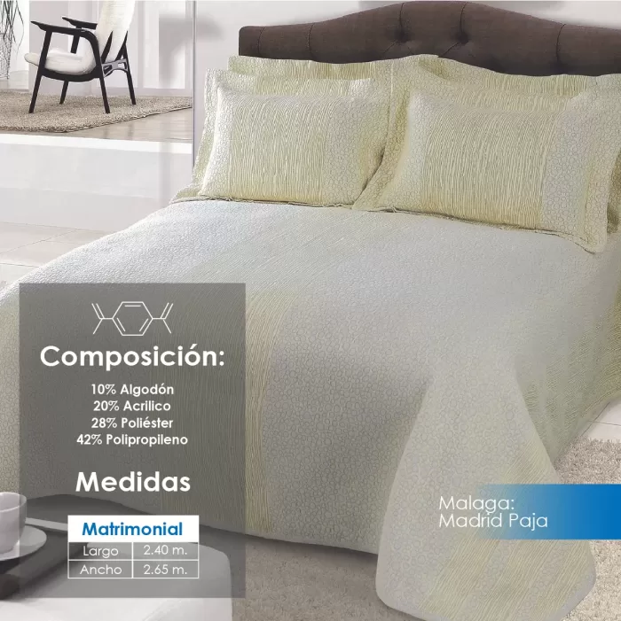 La Colcha Málaga es la elección perfecta para quienes buscan una combinación de calidad, estilo y durabilidad. Confeccionada con una mezcla de materiales cuidadosamente seleccionados —10% algodón, 20% acrílico, 28% poliéster y 42% polipropileno—, esta colcha ofrece un equilibrio ideal entre suavidad y resistencia. El algodón aporta una textura agradable al tacto, mientras que el acrílico y el poliéster garantizan una estructura robusta y resistente al desgaste. El polipropileno, por su parte, añade ligereza y durabilidad, haciendo que la colcha conserve su forma y apariencia a lo largo del tiempo.