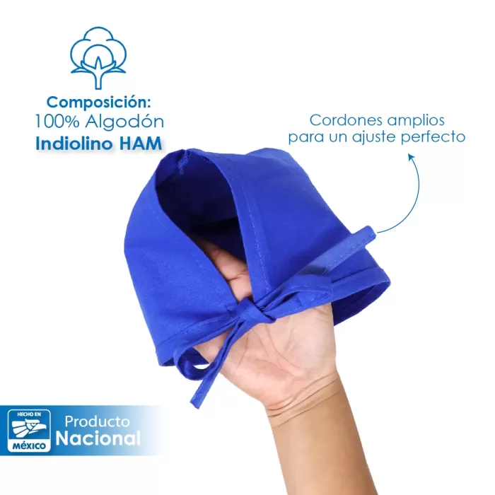 Confeccionado en algodón 100% indiolino, este gorro quirúrgico de 54 cm de circunferencia y 14 cm de altura es suave y cómodo. Su cordón de 25 cm permite un ajuste perfecto para todo el día.