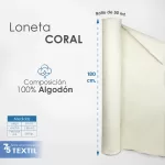Loneta Coral, textura lisa ideal para bastidores, bolsas, cojines y manualidades. Ancho de 180 cm, peso por m2 de 260 g, 100% algodón color crudo.