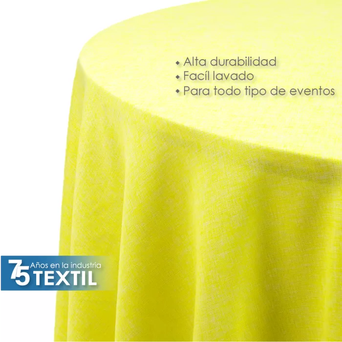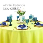 Mantel redondo de lino Ginebra, 100% poliéster con textura de lino natural, diámetro de 2.90 m, ideal para eventos. Resistente y disponible en varios colores.