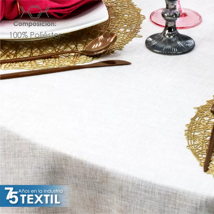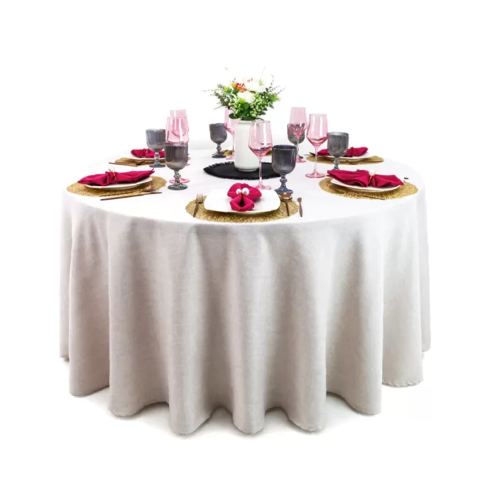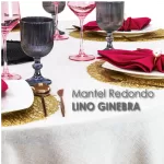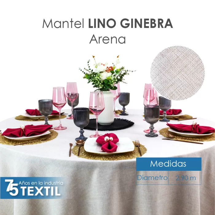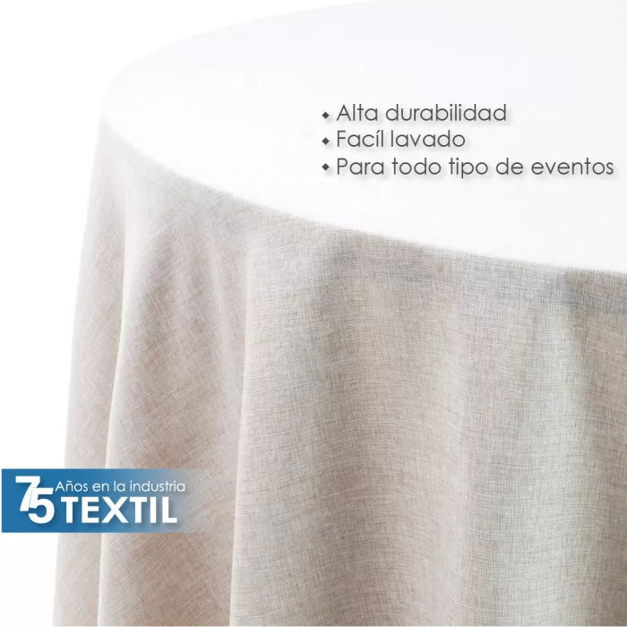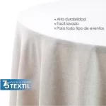 Mantel redondo de lino Ginebra, 100% poliéster con textura de lino natural, diámetro de 2.90 m, ideal para eventos. Resistente y disponible en varios colores.