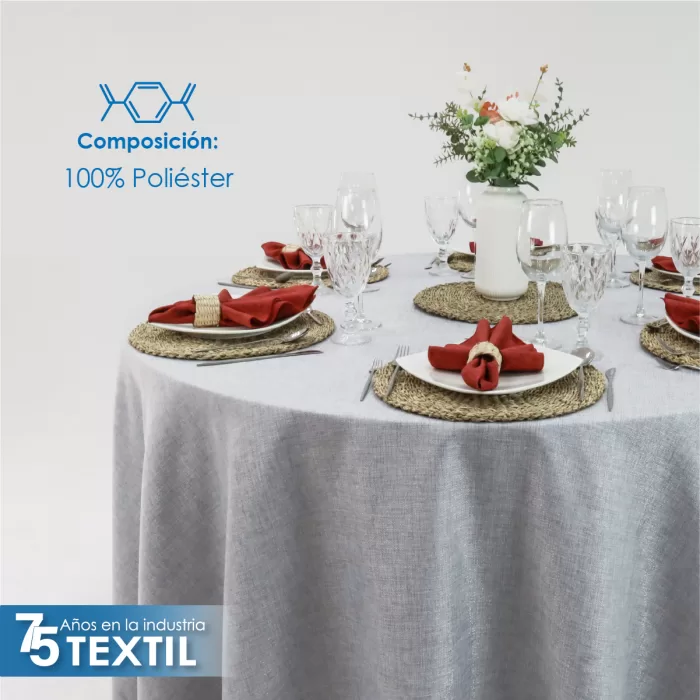 Mantel redondo de lino Ginebra, 100% poliéster con textura de lino natural, diámetro de 2.90 m, ideal para eventos. Resistente y disponible en varios colores.
