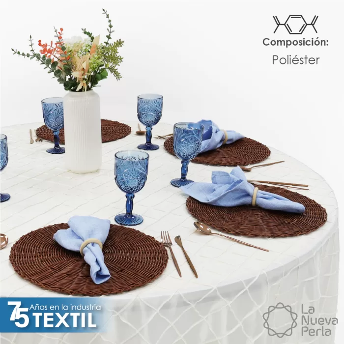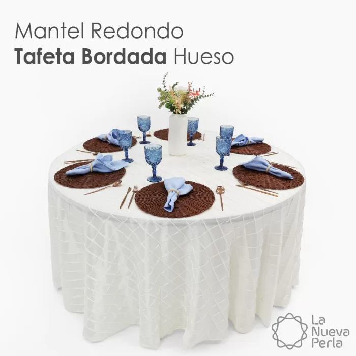Mantel imperial de tafetán bordado, 100% poliéster, estampado con uniones, medida 2.90 de diámetro ideal para eventos. Resistente y disponible en varios colores.