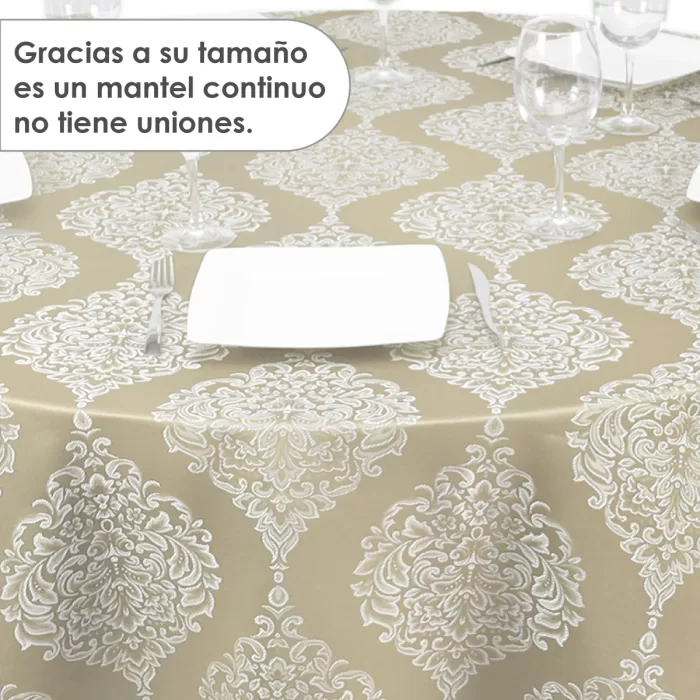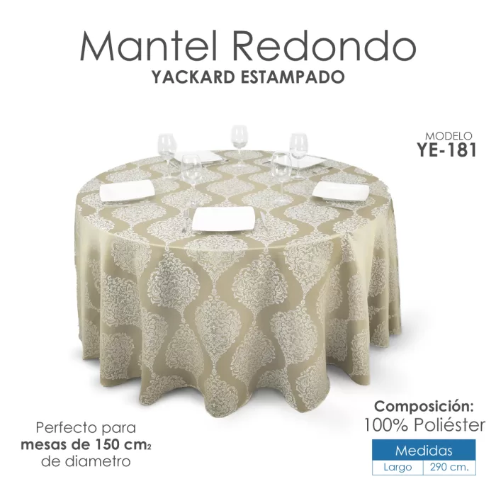 Destaca en tus eventos con nuestro majestuoso mantel redondo de Yackard. Elaborado con un tejido de poliéster de primera calidad, este mantel presenta un diseño estampado elaborado con detalles intrincados, sin uniones visibles, lo que brinda una apariencia impecable en mesas de gran tamaño. Con unas dimensiones expansivas de 290 de diámetro, este mantel es la elección perfecta para cubrir grandes mesas y crear un ambiente de lujo en bodas, banquetes y eventos especiales.