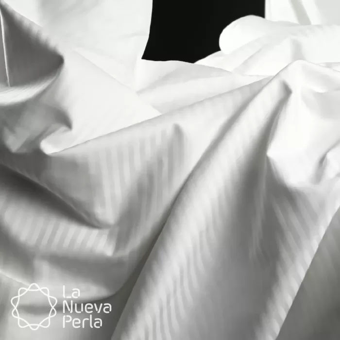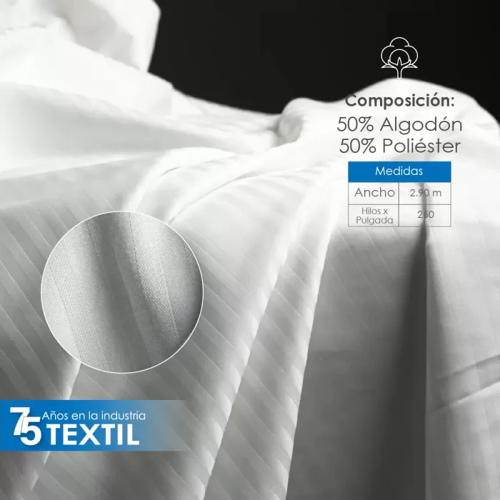 El percal satin rayas de 250 hilos es fresco, suave y perfecto para spa, hospitales y clínicas. Con una composición de 50% algodón y 50% poliéster, en color blanco, ofrece calidad y comodidad. Disponible en rollos de aproximadamente 100 metros, precio por metro.