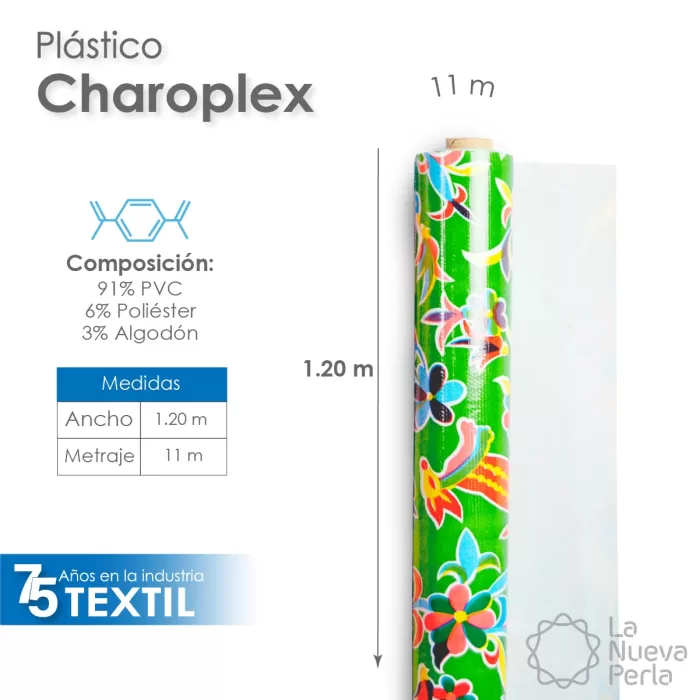 Charoplex, reconocido mundialmente por su calidad y durabilidad. Fabricado con una base de tela de poliéster y algodón, laminado con películas de PVC estampadas y transparentes para un acabado brillante. Disponible en una variedad de diseños. Rollo de 11 metros, ancho de 1.20 metros.
