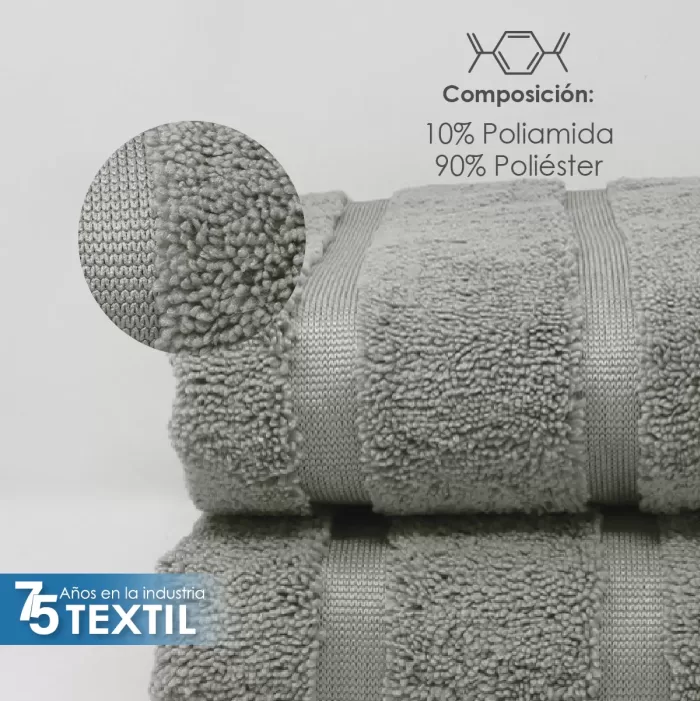 Toalla de microfibra de alta absorción, fabricada con una mezcla de poliéster y poliamida.